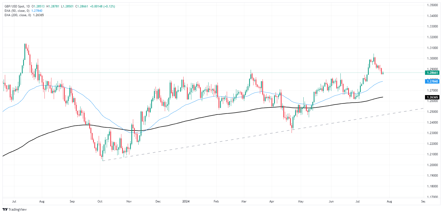 Cable has fallen back below the 1.2900 handle after backsliding from a 12-month peak near 1.3045 set last week. The pair is down around 1.5% peak-to-trough, but near-term momentum still leans in favor of buyers as price action holds on the high side of the 200-day Exponential Moving Average (EMA) at 1.2636.