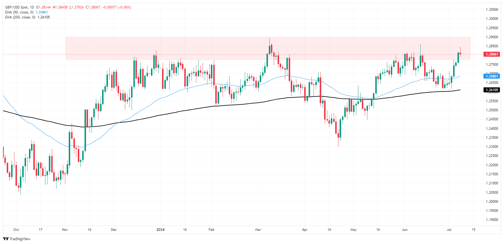 GBP/USD briefly tested a fresh four-week high on Monday, crossing above 1.2840 before broad-market flows dragged Cable back down to the week’s opening bids just north of 1.2800. UK data remains thin this week, leaving traders grappling with peaking rate cut hopes clashing with an overly-cautious Federal Reserve (Fed) that insists on waiting for further signs that US inflation will ease towards the Fed’s 2% annual inflation target.