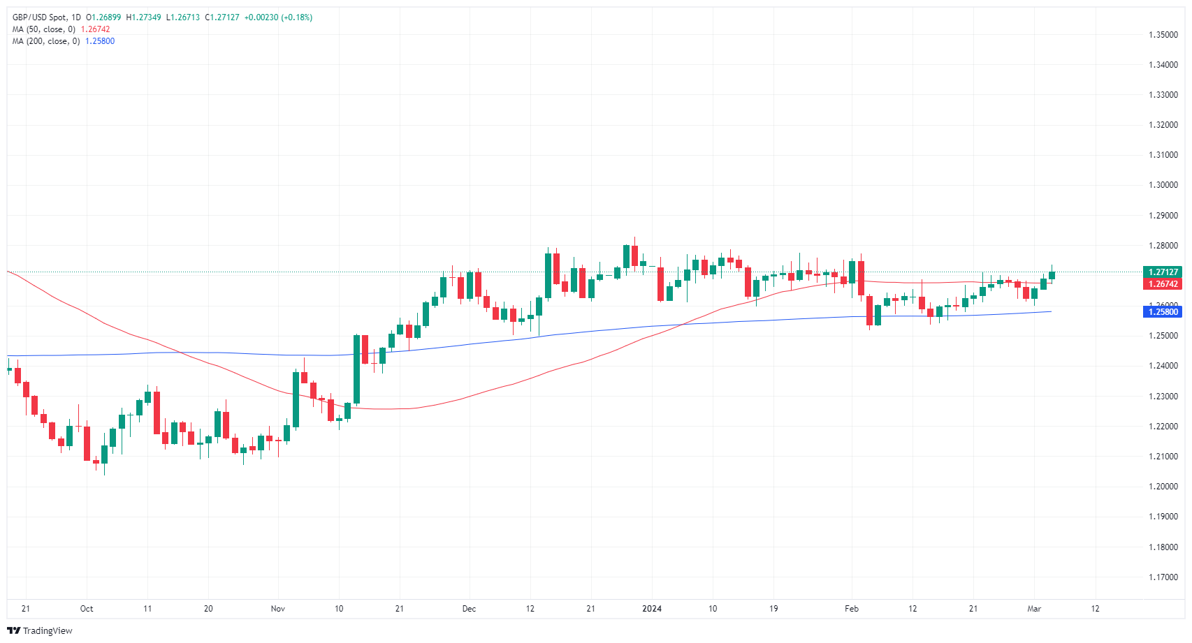 GBP/USD gained ground on Tuesday, marking in an intraday high of 1.2735 after the US ISM Services Purchasing Managers Index (PMI) and Factory Orders both missed expectations. The US Dollar (USD) softened on reaction, but market sentiment is hanging in the midrange as markets gear up for two showings from Federal Reserve (Fed) Chairman Jerome Powell this week.