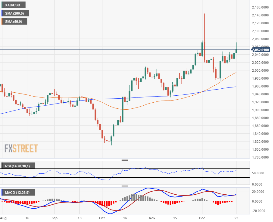 XAU/USD briefly tested above $2,070 on Friday before paring back toward the day’s opening bids. With the Federal Reserve’s (Fed) main interest rate at a 22-year high, markets are incredibly eager for the Fed to begin cutting interest rates, and receding US inflation is pinning investor hopes of an accelerated pace of Fed rate cuts in 2024.