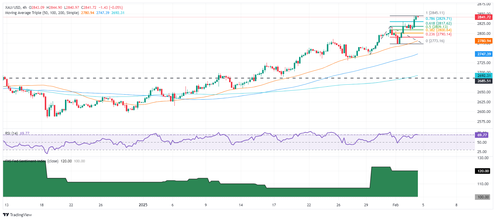 The next resistance would be $2,850 ahead of the 161.8% Fibonacci (Fib) extension at $2,889, ahead of $2,900 as seen on the 4-hour chart.