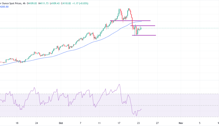 Gold (XAU/USD) fluctuates within a tight range on Thursday, consolidating after a sharp correction from historic highs. At the time of writing, XAU/USD is trading around $4,115, holding steady after two days of declines as safe haven demand remains supported amid a mix of economic jitters and geopolitical tensions.