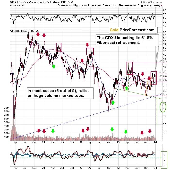 Moreover, please take a look at the areas that I marked with red rectangles. They mark important tops in the GDXJ ETF. In call those cases, junior miners topped by first declining somewhat, then correcting, and then sliding without looking back. In two out of three cases the second (final) top was below the initial one, and in the remaining case (in early 2022), the second (final) top, was slightly higher than the initial one.