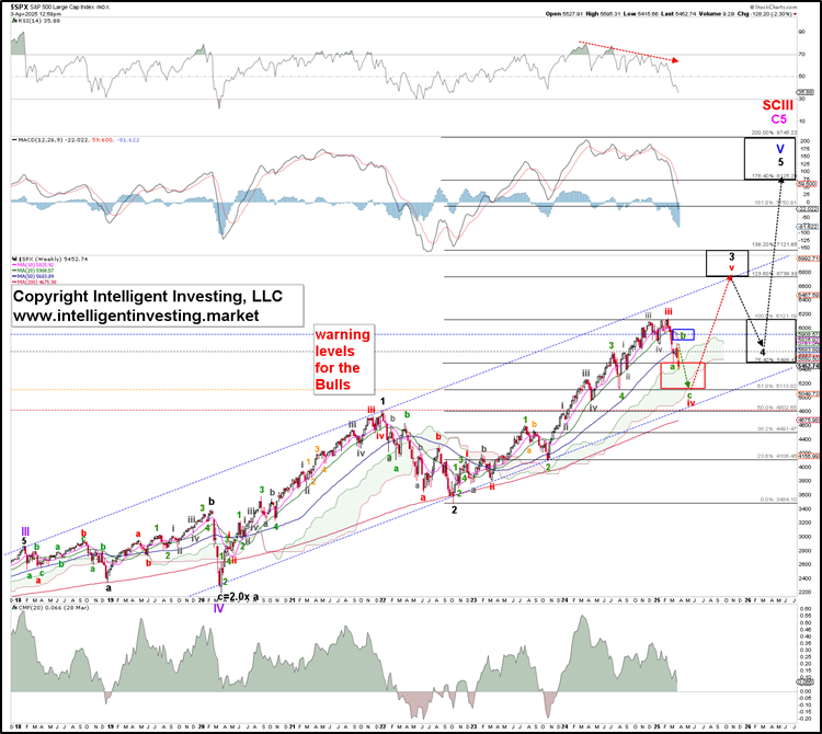 The SPX reached $ 5,784 last week, leaving us just 0.3% short. It dipped below $5,504 on Monday, only to close higher and rebound to yesterday’s peak. However, the response to “Liberation Day” suggests that the green W-c of the red W-iv, ideally at $ 5,140 ± 20 when assuming a standard Fib-based impulse lower, should now be underway. This target zone is close to the ideal level of $ 5,116. See Figure 3 below.