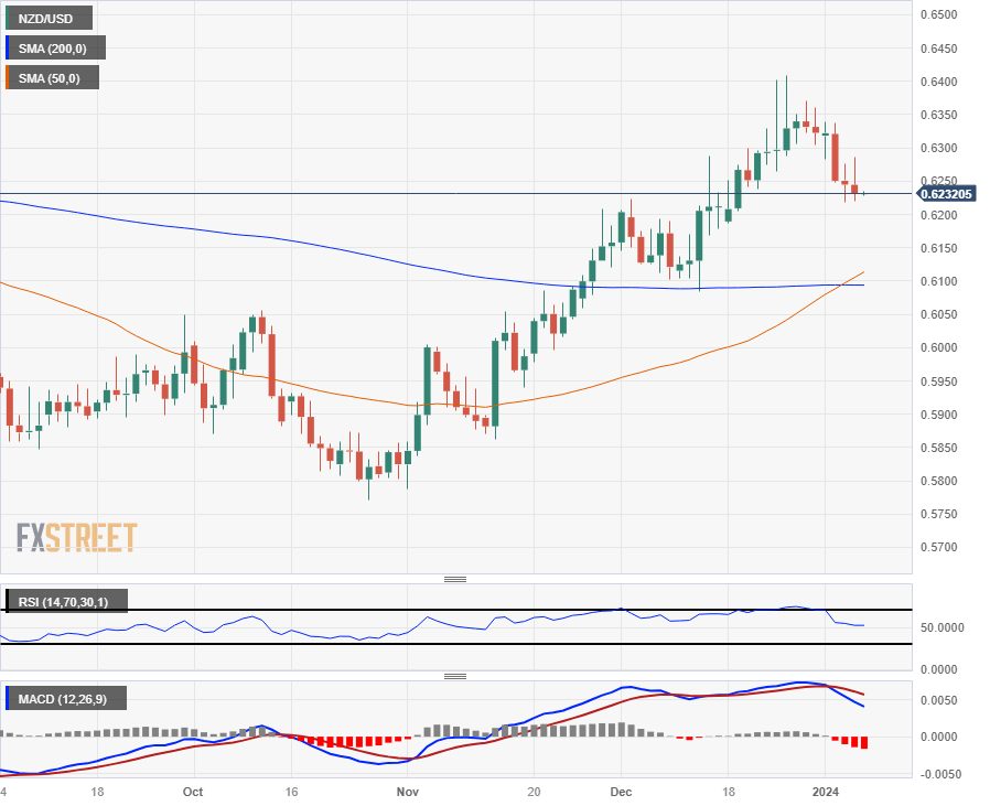 The Kiwi’s up-and-down action on Thursday sent the pair towards the 0.6300 handle before markets reserved direction, dragging the NZD/USD back into the week’s bottom bids near 0.6220. The Kiwi continues to trade on the low side of the 200-hour Simple Moving Average (SMA), which is declining into the 0.6300 price level and acting as a near-term technical ceiling.