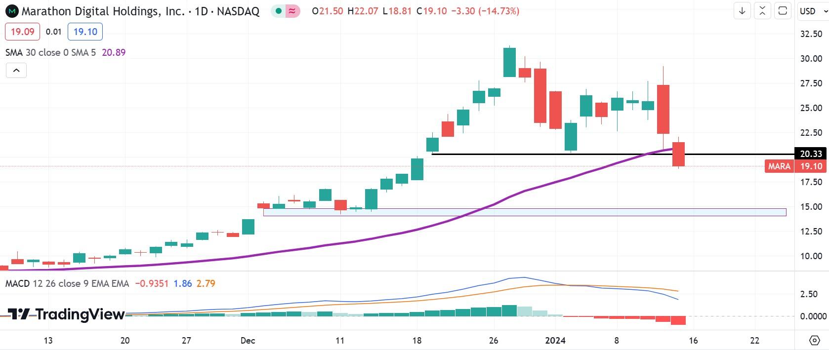 Marathon Digital is yet another victim of the oft-said adage, “Buy the rumor, sell the news.” The US Securities & Exchange Commission (SEC) approved 11 spot Bitcoin ETFs on Wednesday, and they all began trading on Thursday.