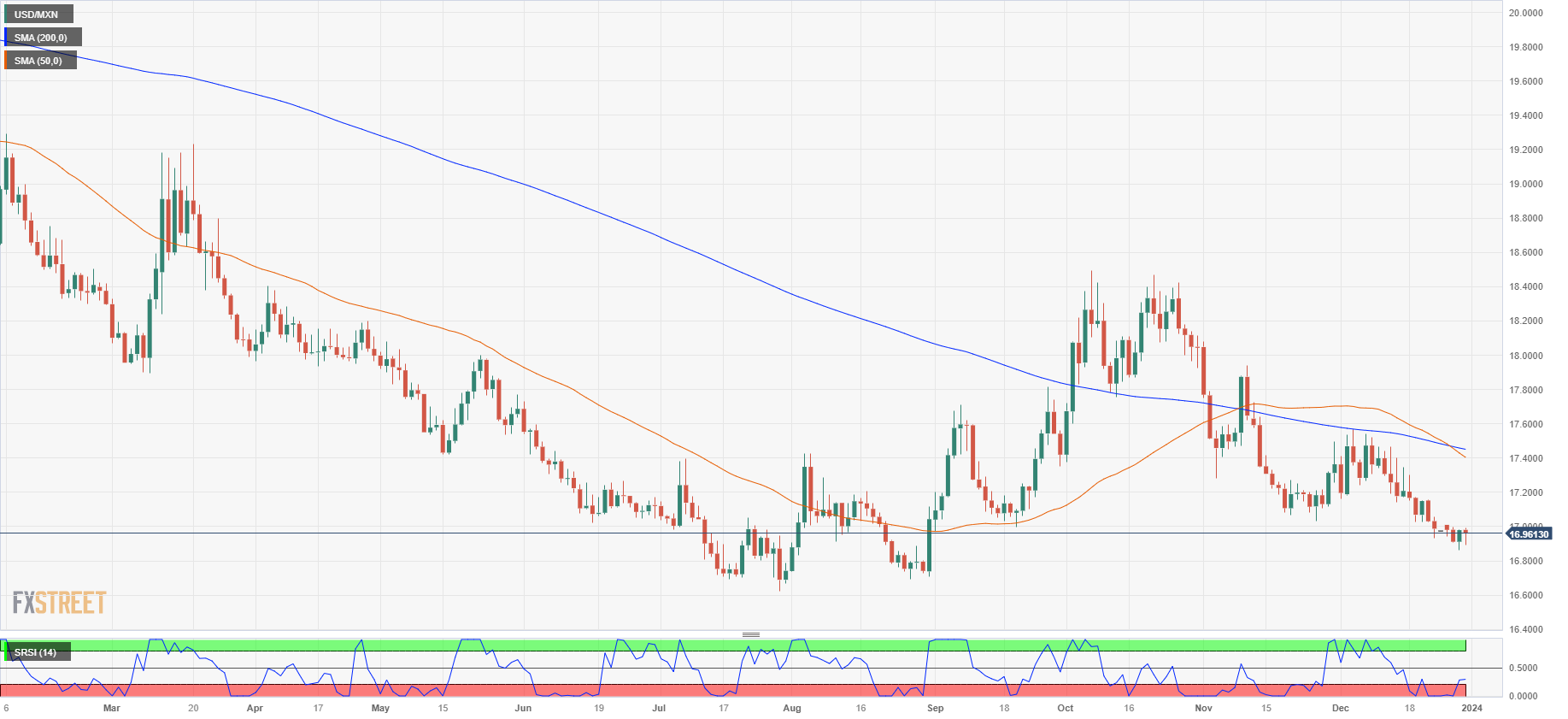 Despite the USD/MXN firmly pinned into the low end and the 50-day Simple Moving Average (SMA) confirming a bearish cross of the long-term 200-day SMA near 17.45, technical traders will note that indicators have been hovering into oversold conditions for some time, leaving the USD/MXN exposed to an extended recovery until hitting technical resistance at the 200-day SMA. The last swing high region is also priced in near 17.50.