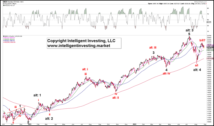 Lastly, going back to Figure 1, the bears do not want to see the index break above last week’s high, as that would put five (green) waves on the chart instead of three. Namely, that would mean the August 5 low was the black “alt: 4” low, as shown in Figure 2. Thus, although our target zone outlined in early August for this (retracement) rally has been reached, and our preferred long-term view is that of a significant top being in place since July, the Bears still have more work to do before they can declare victory.
