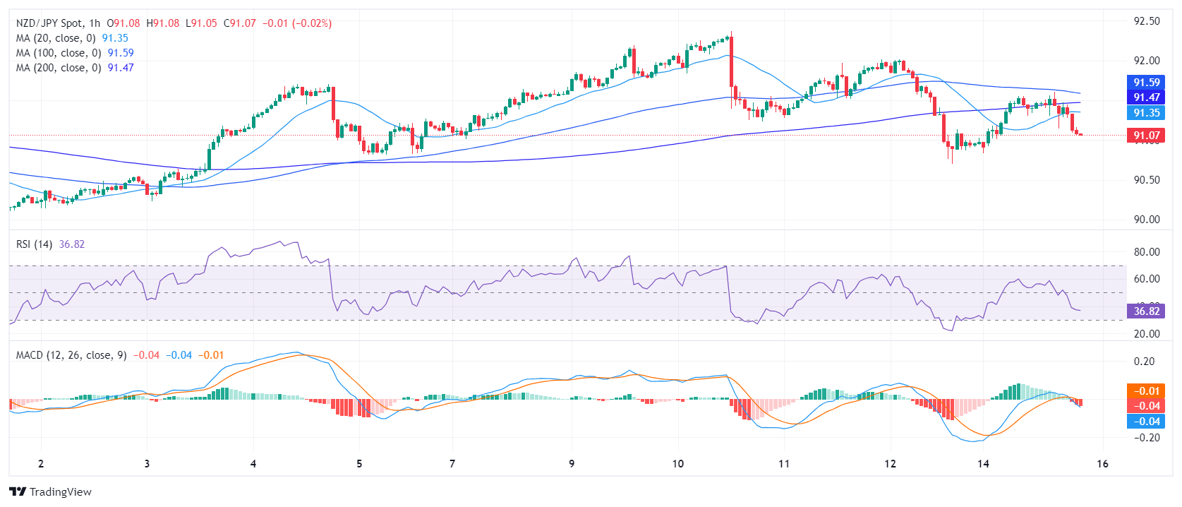 The NZD/JPY is trading at the 91.14 level, securing some daily gains after peaking at a daily high of 91.60. Despite a bearish short-term trend, the pair maintains a bullish position over the longer term, being positioned above key Simple Moving Averages (SMAs). For the short term, bears seem to be gearing up and bulls starting to weaken.