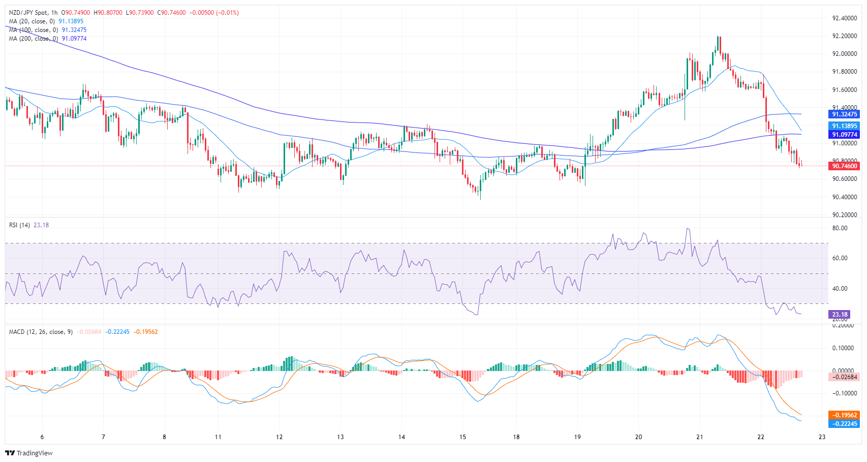 The NZD/JPY pair is trading at 90.748, marking a significant dip of 0.98%. Despite the presence of strong selling pressure, the pair persistently resides above its 100 and 200-day Simple Moving Averages (SMAs). This suggests a dominant bullish force in long-term time frames. But the fact the sellers conquered the 20-day average, paints the short-term outlook with a negative tone.
