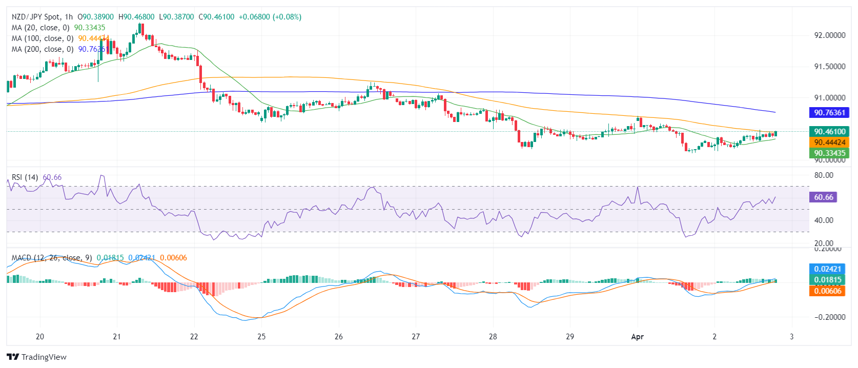 In Tuesday’s session, the NZD/JPY pair is trading with a slight rise to 90.42, marking a 0.16% gain. Despite this, sellers retain dominance within the broader market scenario, hinting towards an entrenched bearish sentiment. Encouragingly though, hourly data suggests the potential for short-term bullish corrections, indicating a touch of buyer resilience.