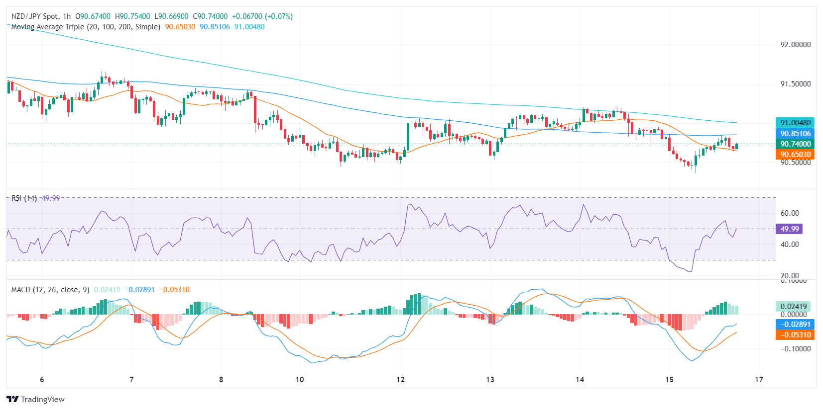 In Friday’s session, the NZD/JPY is trading at 90.70, recording a slight loss of 0.22% after bottoming at a low of 90.35. The positioning of the pair above the key 100 and 200-day Simple Moving Averages (SMAs) might hint at bullish prospects in the overall trend, yet the shorter technical outlook tilts toward the bears as it trades below the 20-day average.