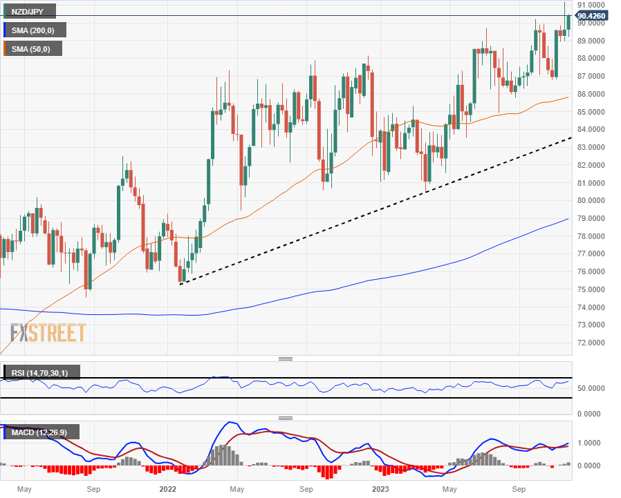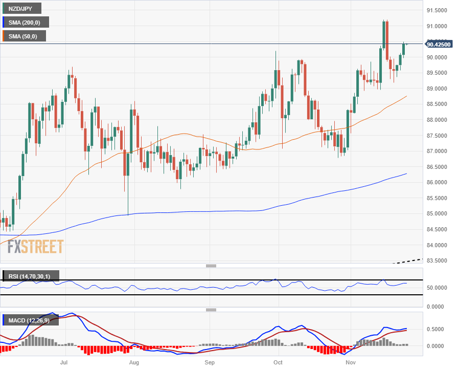 The NZD/JPY rolled up almost half a percent on Thursday as the Kiwi (NZD) sees a continuation of its climb up and over the Japanese Yen (JPY). The pair has closed in the green for three consecutive trading days and has pared back half of its losses after tumbling last week from an eight-year high of 91.20.