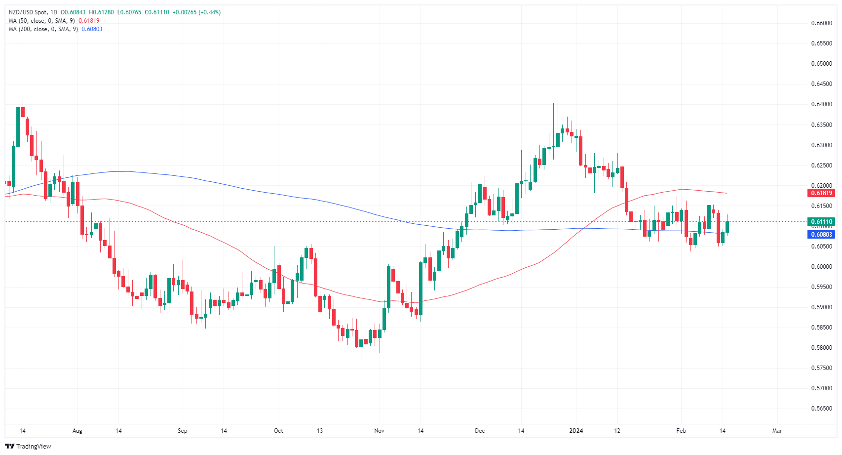 NZD/USD remains trapped in a near-term technical congestion zone with daily candles continuing to cycle the 200-day Simple Moving Average (SMA) near 0.6080 with a rough consolidation zone marked out between 0.6150 and 0.6050.