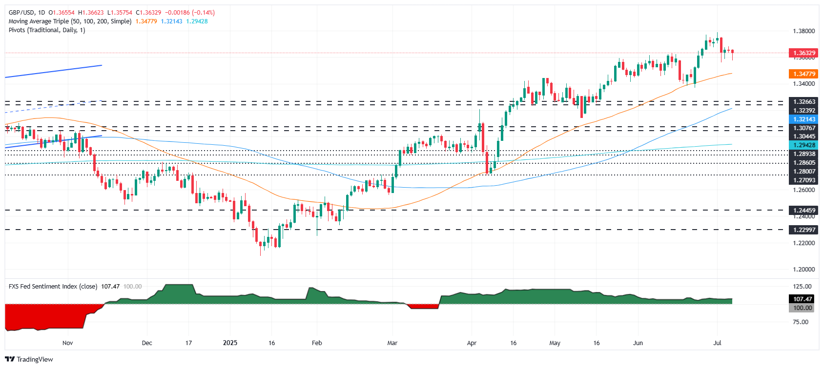 GBP/USD edges higher after two days of losses, trading around 1.3630 during the Asian hours on Tuesday. The pair appreciates as the US Dollar (USD) loses ground as traders adopt caution after US President Donald Trump announced updated tariff rates on 14 countries that have yet to secure trade deals with Washington.