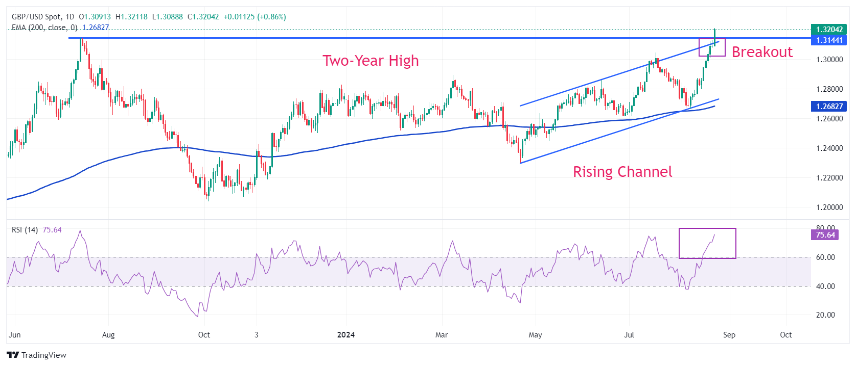 The Pound Sterling (GBP) extends its winning streak for a seventh trading session against the US Dollar (USD) on Friday. The GBP/USD pair posts a fresh two-year high at 1.3200 as the US Dollar (USD) slides toward a year-to-date low after a dovish guidance on interest rates by Federal Reserve (Fed) Chair Jerome Powell in the Jackson Hole (JH) Symposium. Read More…