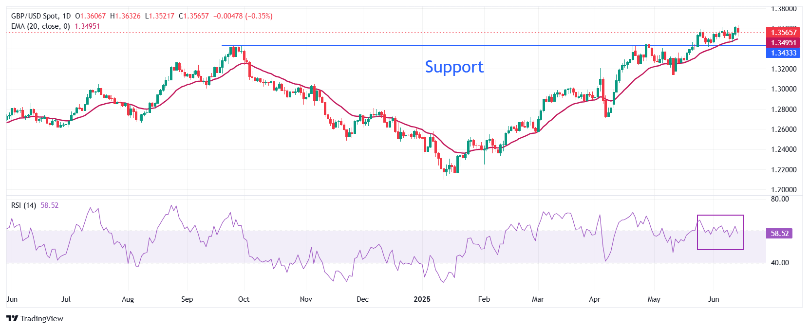 GBP/USD is tumbling over 0.40% on Friday as geopolitical tensions triggered a flow towards the US Dollar (USD) haven status after Israel launched an attack on Iran, which escalated the Middle East conflict. The pair traded near 1.3550s after hitting a three-year peak of 1.3632. Read More…
