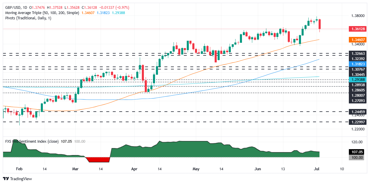 The GBP/USD pair extends the decline to near 1.3625 during the Asian trading hours on Thursday. The Pound Sterling (GBP) faces some selling pressure amid a selloff in British government bonds. Traders will closely watch the US June employment data later on Thursday, including Nonfarm Payrolls (NFP), Unemployment Rate and Average Hourly Earnings.
