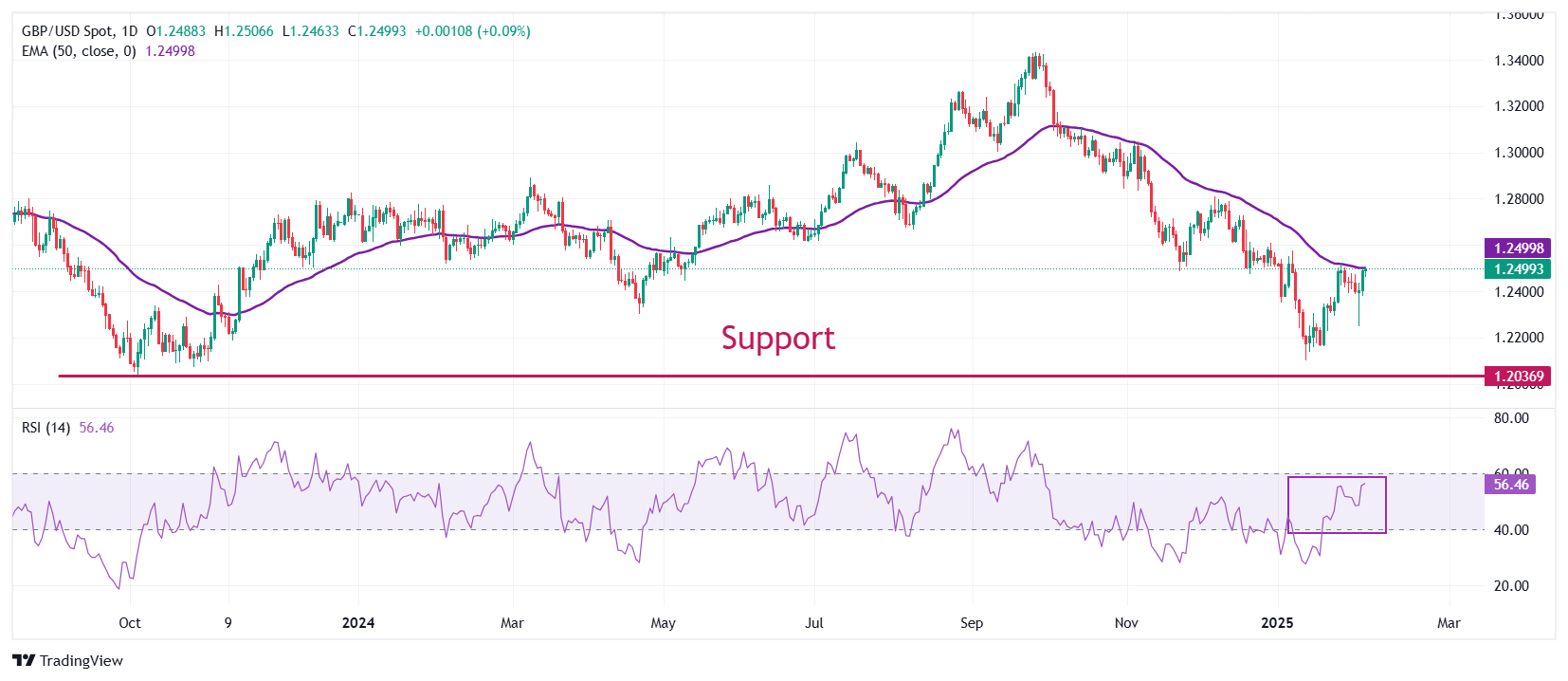 GBP/USD holds steady below 1.2500; softer USD acts as a tailwind