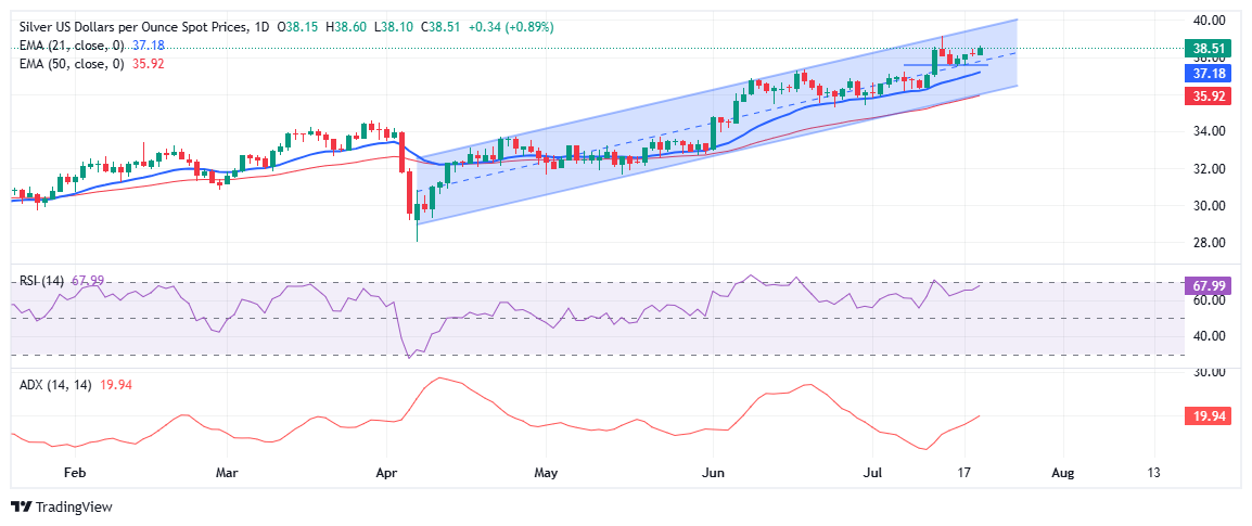Silver (XAG/USD) starts the week on firmer ground after a mild pullback last week. As of now, the metal is trading near $38.50 during the early American trading hours on Monday, just shy of the multi-year high of $39.13 set on July 14. Although the recent rally has lost some momentum, technical indicators are turning bullish again across both short-term and longer-term charts.