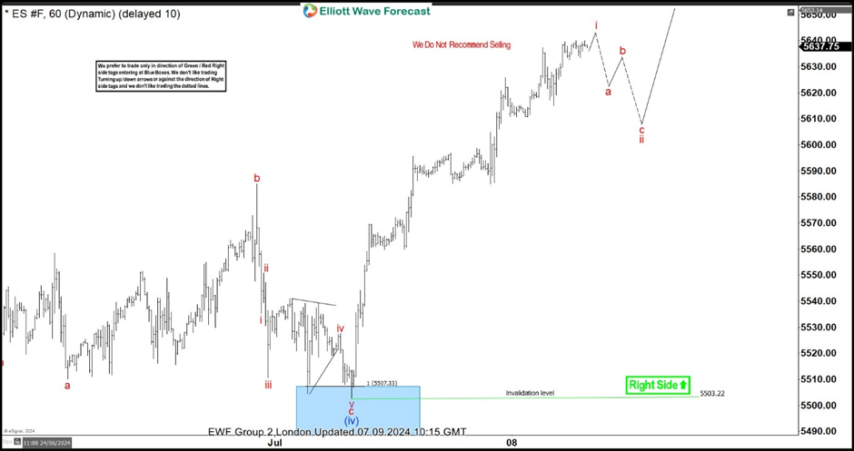 In this technical blog, we will look at the past performance of the 1-hour Elliott Wave Charts of S&P 500 E Mini ES_F. We presented to members at the elliottwave-forecast. In which, the rally from the 31 May 2024 low unfolded as an impulse structure and showed a green right side tag. Suggested that the index should see more upside extension to complete the impulse sequence. Therefore, we advised members not to sell the index & buy the dips in 3, 7, or 11 swings at the blue box areas. We will explain the structure & forecast below: