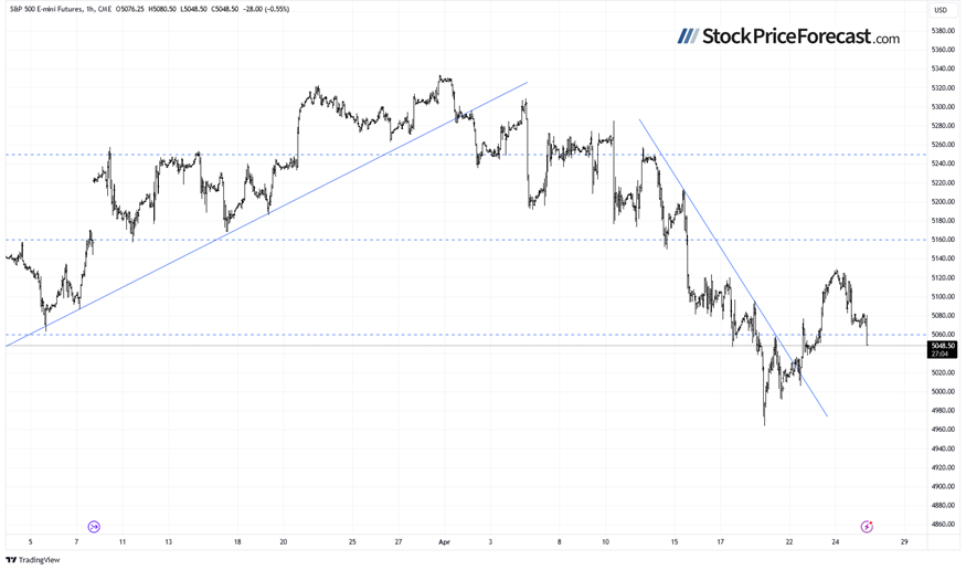 Let’s take a look at the hourly chart of the S&P 500 futures contract. Yesterday, the market reached a local high of around 5,129, which marked the highest point of the rebound. The after-hours price action pushed the contract lower, towards a support level of around 5,050-5,070. The resistance remains at around 5,100-5,120.