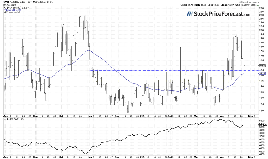 The VIX index, also known as the fear gauge, is derived from option prices. In late March, it was trading around the 13 level. However, recent market volatility has led to an increase in the VIX. On Friday, it reached a high of 21.4, the highest since late October, indicating fear in the market. This week, it has been retracing that advance, reaching below the 16 level on Tuesday and yesterday.