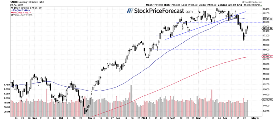 The S&P 500 index accelerated its downtrend last week, extending a correction from the March 28 record high of 5,264.85 on Middle East tensions, strong U.S. dollar. On Friday, it sold off below the important 5,000 level, and this week, it rebounded and retraced some of the declines.