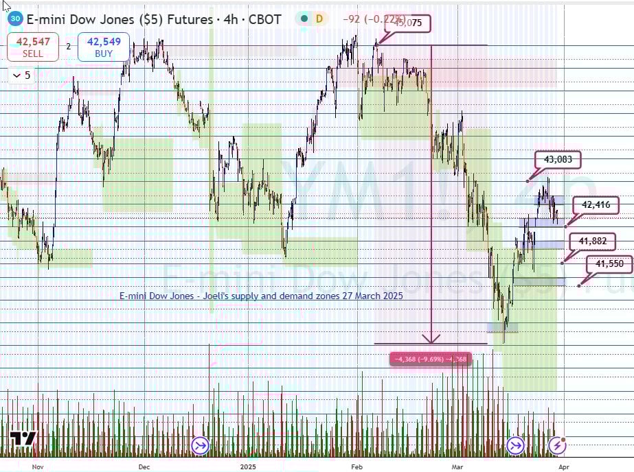 Dow futures also reflect weak momentum, retreating after a 50% retracement of the prior 9% decline from 45075 to 40707, facing rejection at 43083.