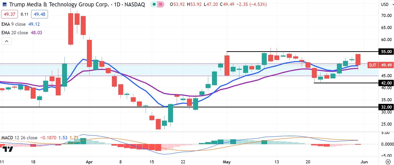 Trump Media stock has touched both the 9-day and 20-day Exponential Moving Average (EMA) in Friday’s session but also resulted in a range high up to $53.92. Any return to territory above $55 is a sign that a rally is back in play.