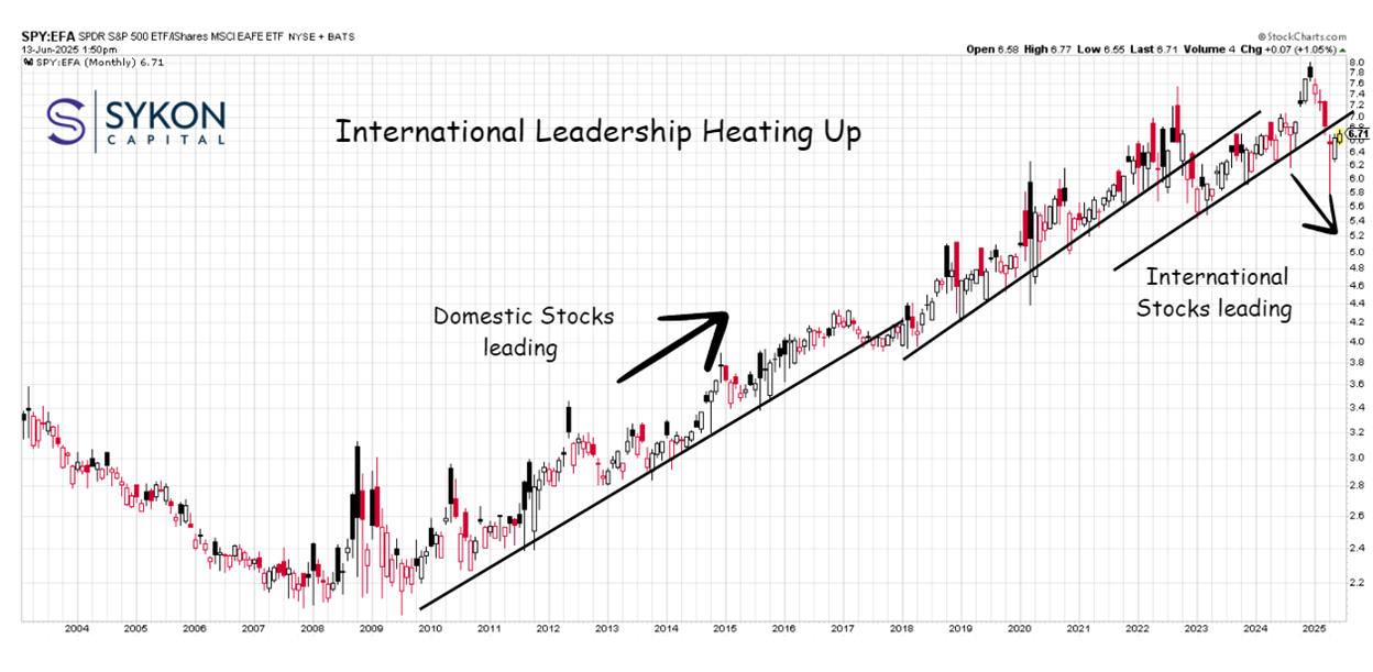 Continuing our focus on structural market shifts, international equities may be quietly reclaiming a leadership role. A review of the monthly chart shows relative strength beginning to tilt away from U.S. equities, marking a possible inflection point after more than a decade of U.S. outperformance.