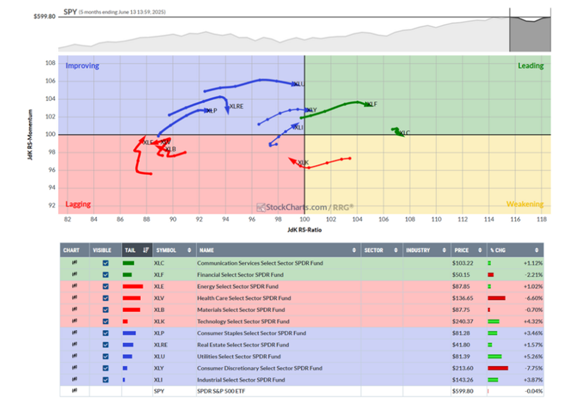 Using Relative Rotation Graphs (RRGs), we can visualize how sectors cycle through phases of leadership. Stocks typically rotate clockwise through the four RRG quadrants: from green (Leading), to yellow (Weakening), red (Lagging), and eventually blue (Improving).