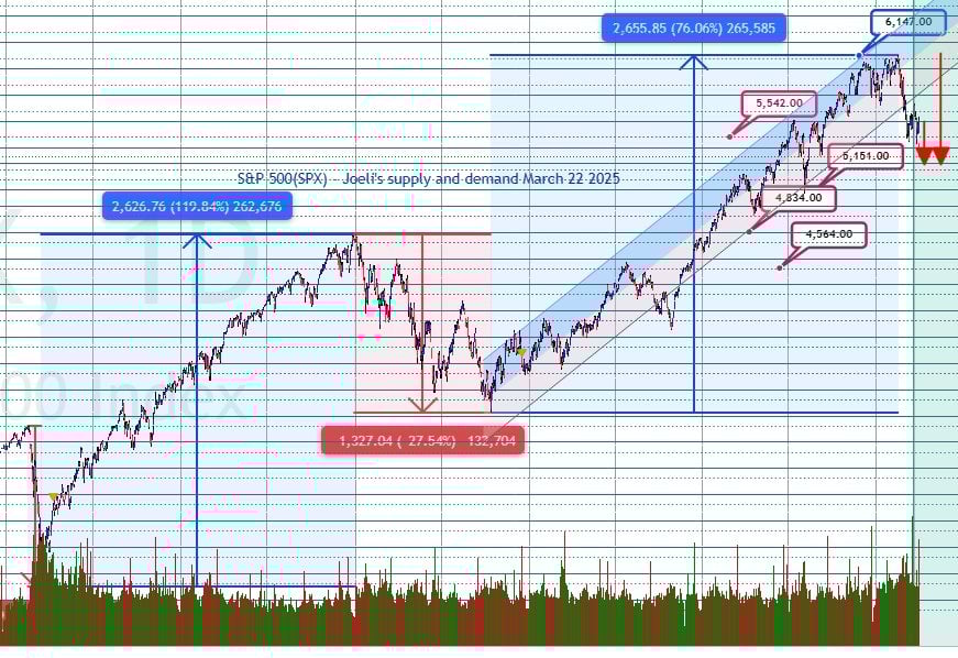 The S&P 500 (SPX) has mirrored the Nasdaq’s weakness, suffering severe losses and declining over 16% from its record highs. In the last two days alone, SPX dropped 6%, underscoring market panic. Currently, the index is testing a significant technical zone at 5151—the second stage of its corrective cycle identified in December’s analysis.