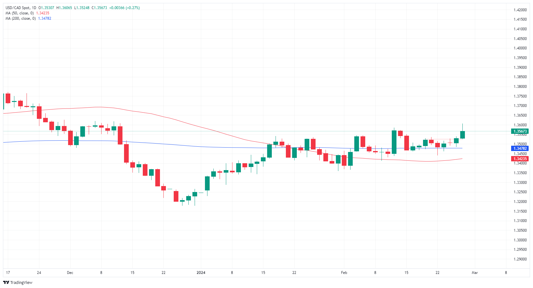 USD/CAD rallied on Wednesday, briefly crossing the 1.3600 handle before paring back into recent technical levels. The pair found a fresh ten-week high at 1.3606, but 1.3580 remains a tricky barrier to break.