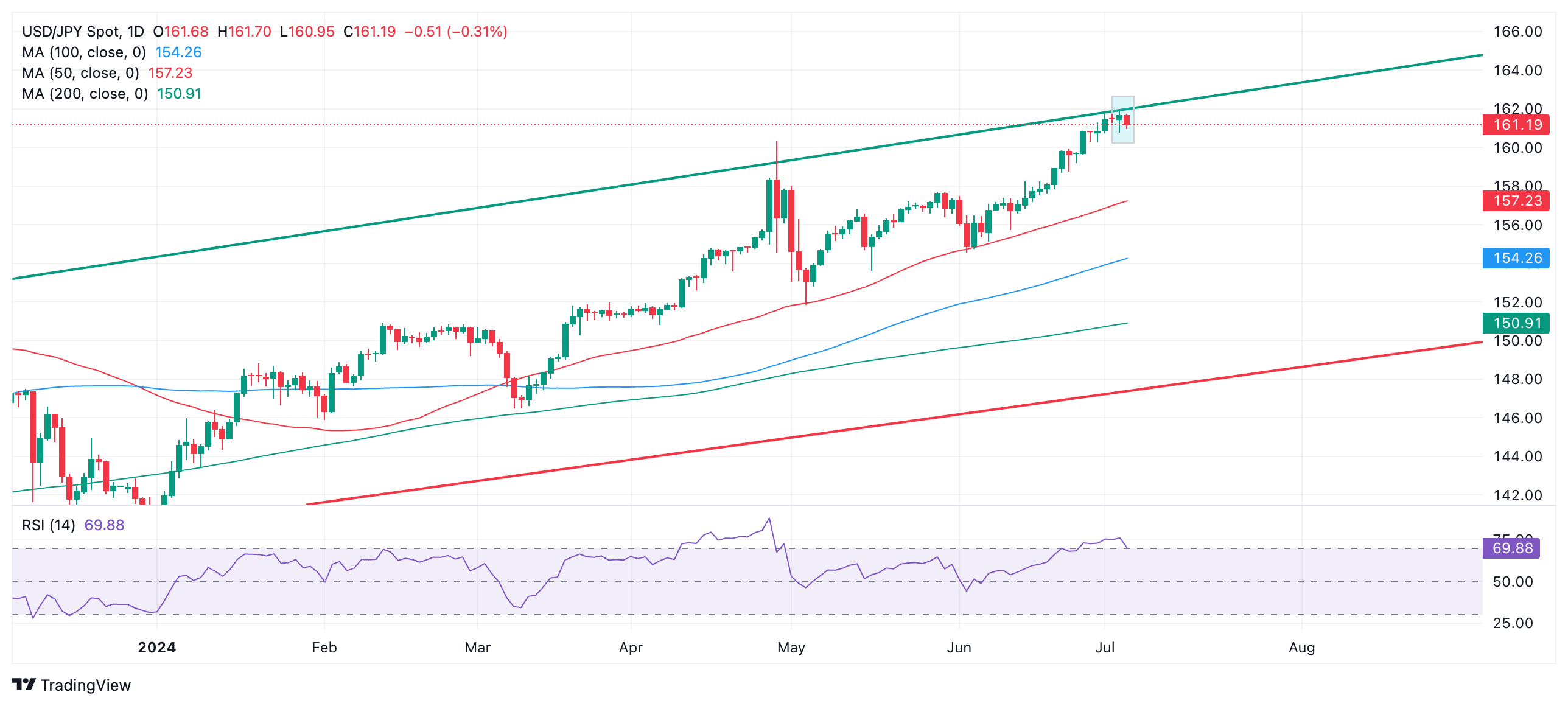 USD/JPY has reached the top of a rising channel it has been in since the start of 2023. Although it is in an uptrend on all timeframes there is a growing risk it is about to correct back.