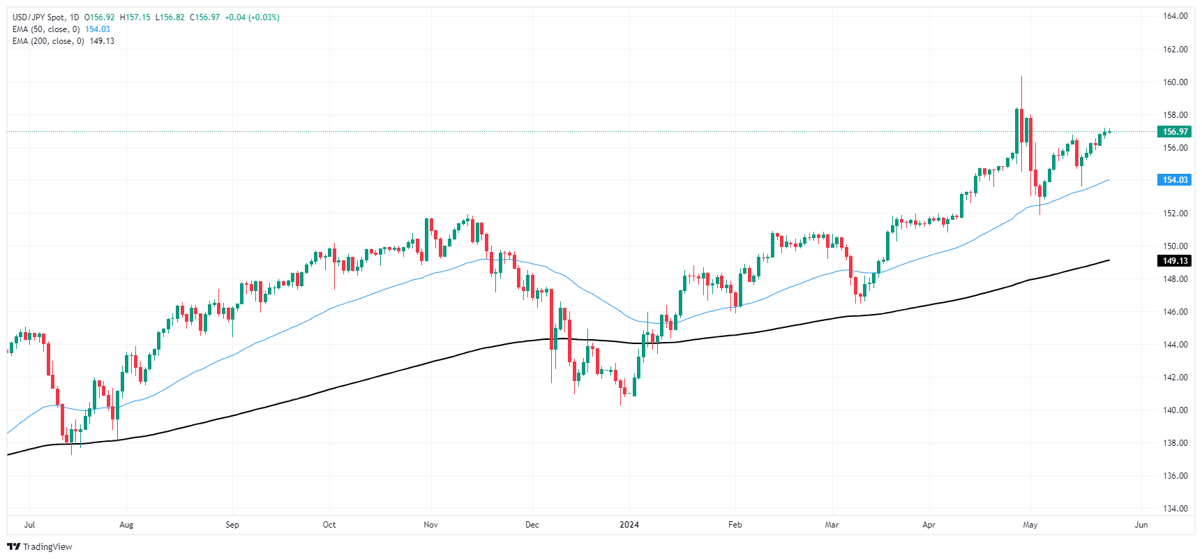 USD/JPY cycled the 157.00 handle on Friday, churning chart paper close to near-term highs. USD/JPY has closed in the green for all but three of the last 15 consecutive trading days, recovering from a post-”Yentervention” low near 152.00.