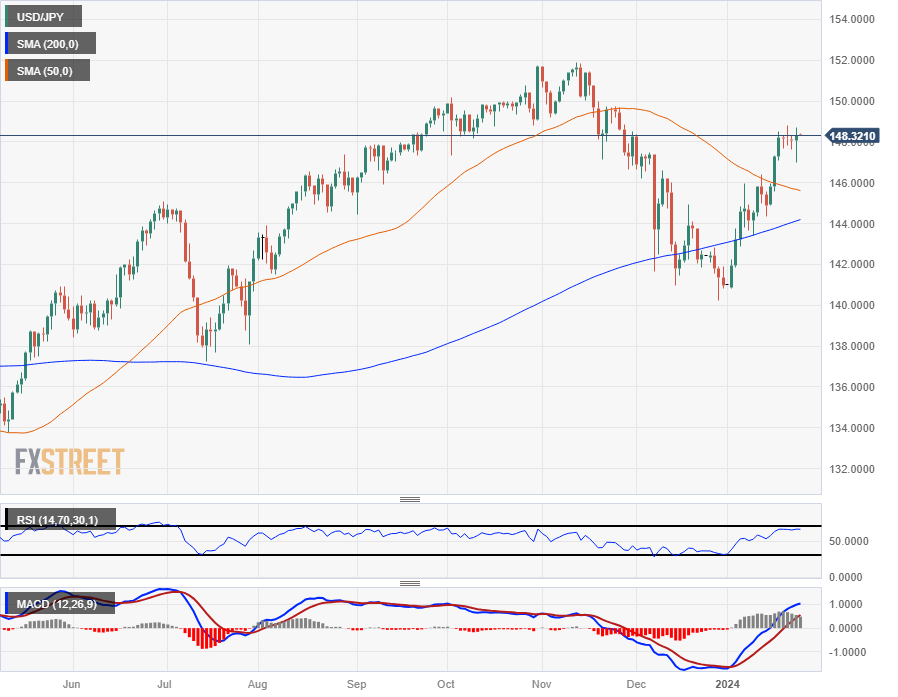 USD/JPY continues to run ahead of the 200-hour Simple Moving Average (SMA) rising into the 147.00 handle, and the pair is up over 5% from 2024’s opening bids as Greenback bidding pressure keeps the pair close to medium-term high bids.