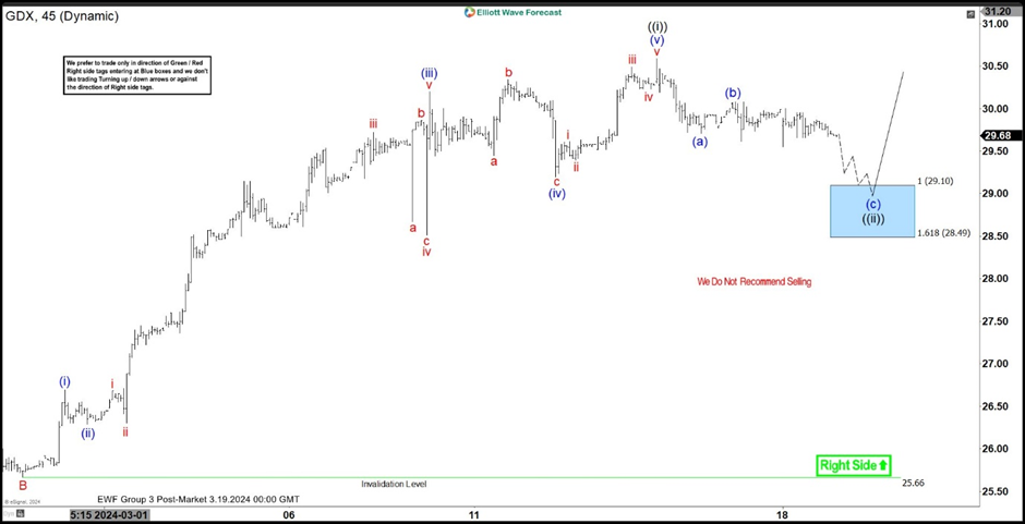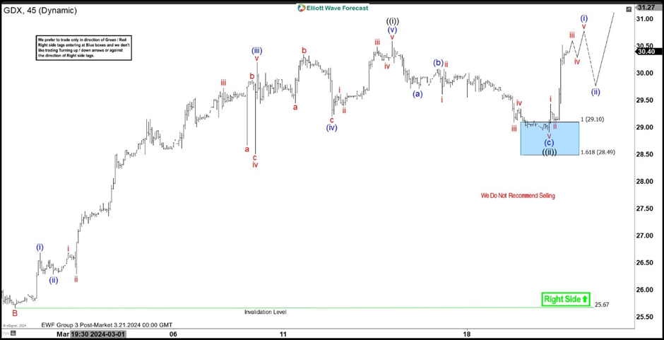 Hello everyone. In today’s article, we will look at the past performance of the 1H Hour Elliott Wave chart of VanEck Gold Miners ETF ($GDX) . The rally from 2.28.2024 low at $25.66 unfolded as 5 waves impulse. So, we expected the pullback to unfold in 3 swings and find buyers again. We will explain the structure & forecast below: