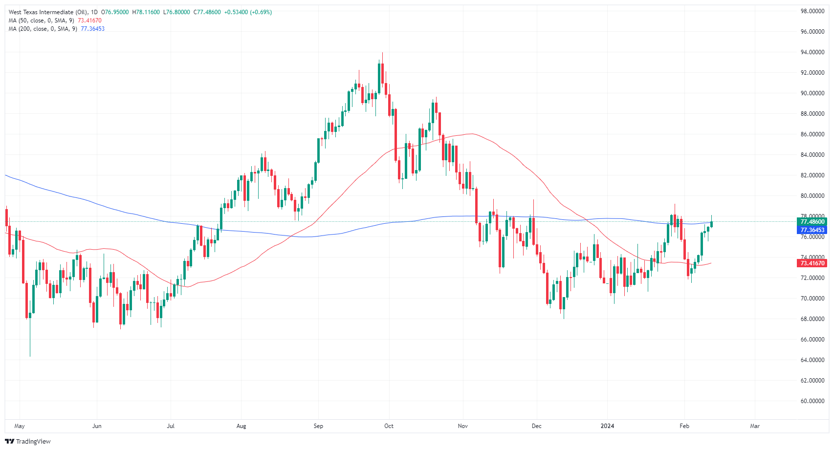Tuesday’s bullish push left WTI overextended into the 200-day SMA priced in near $77.36, and a failed bullish climb over the key technical indicator will leave WTI bids exposed to an extended backslide into early February’s bottom bids near $72.00.