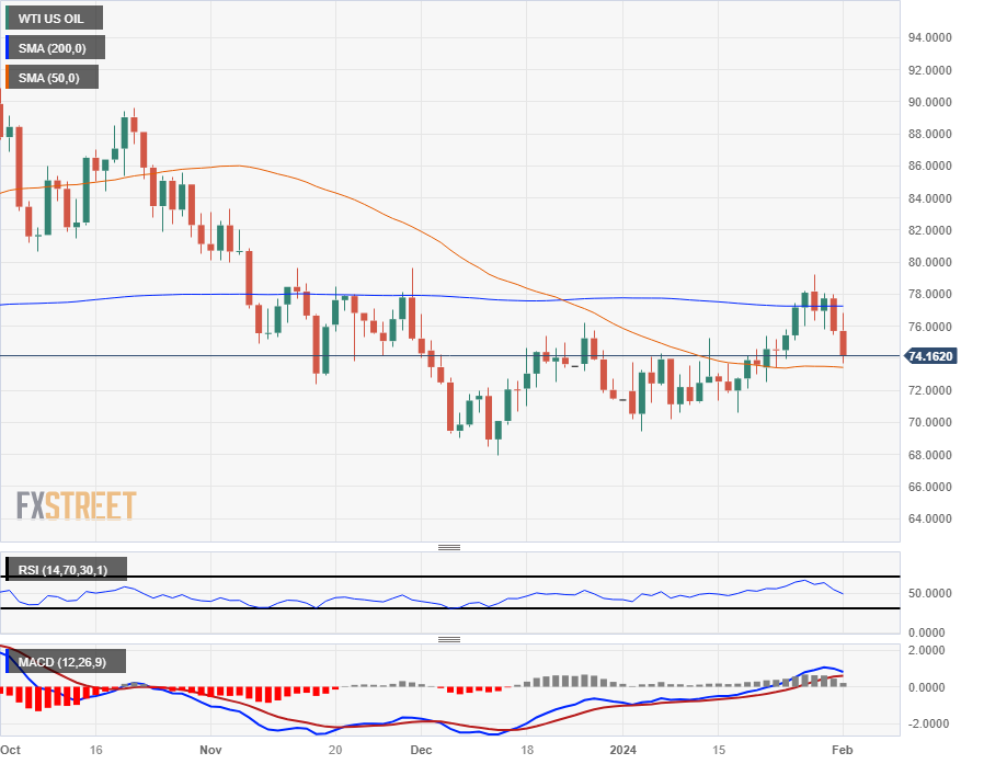 WTI Crude Oil saw a sharp decline drag US barrel bids below the 200-hour Simple Moving Average (SMA) near $76.00, and WTI is testing the $74.00 per barrel neighborhood at its lowest bids in a week.