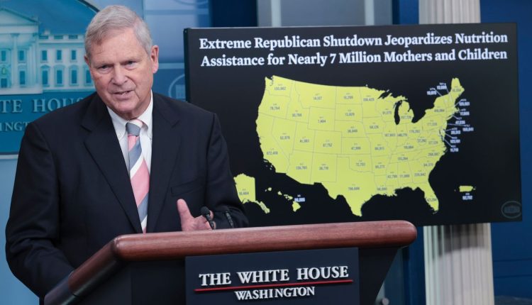 Some 7 million mothers and children would lose government benefits to buy food if the federal government shuts down, Secretary of Agriculture Tom Vilsack said Monday.