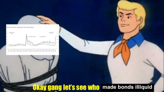 Apollo’s chart specifically looked at bid-ask spreads on sub-$900mn bonds issued at least two years ago, ie slightly stale, less-traded “off-the-run” securities. These were the ones that Sløk called “virtually untradeable”, not the liquid half of the US corporate bond market.