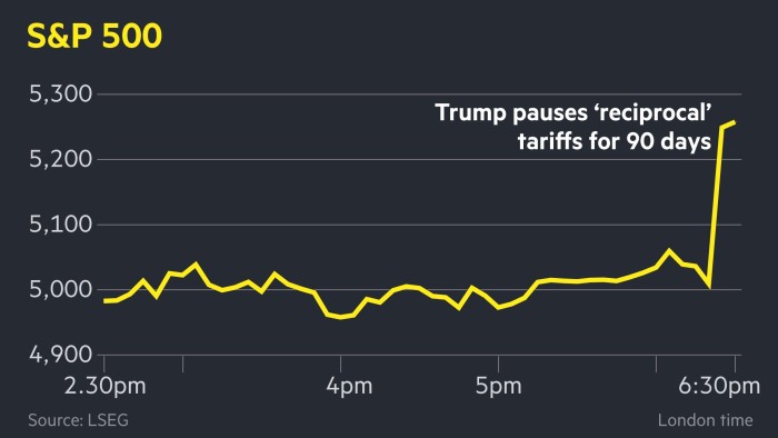 Donald Trump said he had authorised a 90-day pause in additional tariffs on a wide range of countries that were willing to negotiate with the US, the first sign that the president was retreating from a full-blown trade war.