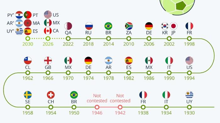 As Statista’s Martin Armstrong shows in the infographic below, since 1930, the FIFA Men’s World Cup has been held every four years, with only two interruptions caused by the Second World War, in 1942 and 1946.