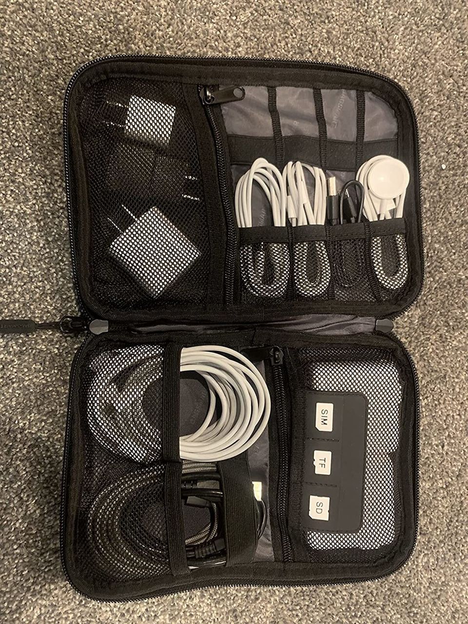 An electronics organizer to keep all your cords, cables, SD cards and plugs together