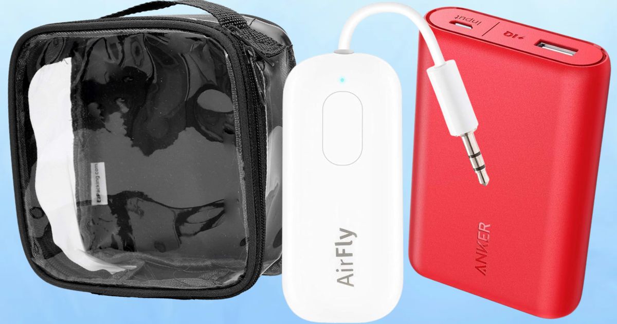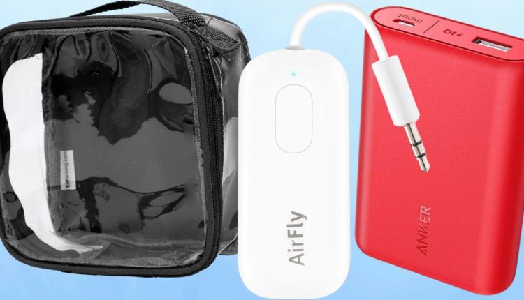 An AirFly wireless transmitter that will connect to your wireless headphones to let you watch movies on your flight
