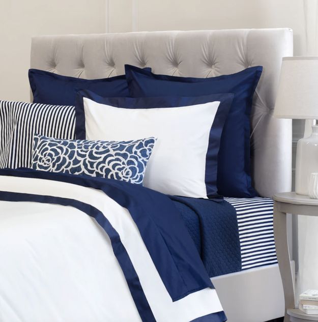 A luxe duvet cover with tailored navy blue borders for 20% off list price