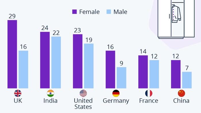 As the chart above shows, female shoppers are more often guilty of wardrobe overload across countries.