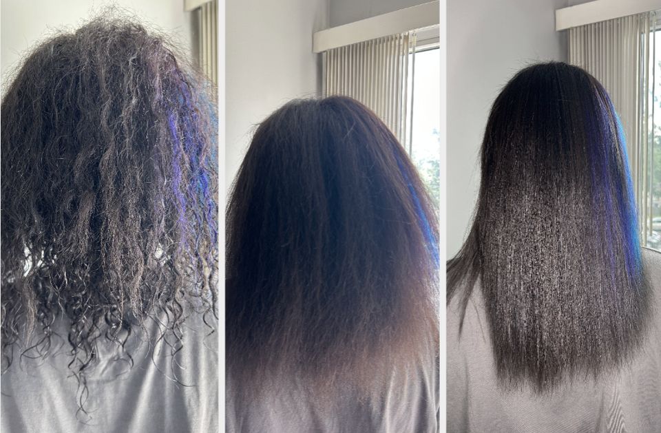“You see that shine? That volume? That bounce? Babyyyy my hair is FLAWLESS. Witchcraft, right? Oh, and if you could feel it?! HONEYYYY, so, so soft and silky. It is seriously bone-straight and looks and feels soooo healthy! And, my hair is NATURAL (other than the obvious blue dye); I haven’t used relaxers or keratin treatments in over 10 years. Now, I am by no means a hairstylist, and nothing tops their magical hands, but sweetieeeee, these products blow my mind. This trio does what needs to be done, and like, I did it — I delivered these results. Nothing has ever made my hair look like this unless a stylist was styling my hair. And when I step out of my house, you cannot tell me I’m not the most fabulous person in the world — I’m literally Beyoncé. My hair flows and bounces as if I have a personal fan in front of me, and I CANNOT keep my hands out of my hair. The shampoo and conditioner help get ALLLL the product buildup out of my hair and leave my hair feeling squeaky clean. Then, I add my serum (before blow-drying and again before straightening), and BAM — I’m flawless. The combo of all three is just *chefs kiss*, and they help protect my hair from heat damage. If you want a magic wand to set everything off, invest in the Babyliss straightener! My hairdresser uses it so I grabbed one too and now I always look like I just stepped out of the salon.”