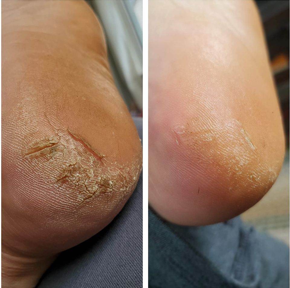 Promising review: “I used these socks with Dr. Scholls severe cracked heel balm, every night for the first week and then on and off for the next few weeks. Photos (shown above) are about three weeks apart. My heels had deep, painful cracks that would occasionally bleed, and now they’re almost gone.” — Manuel C.